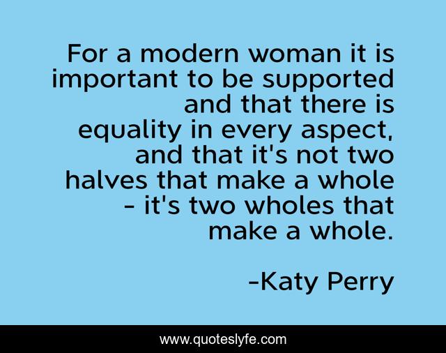 This page presents the quote "For a modern woman it is important to be supported and that there is equality in every aspect, and that it's not two halves that make a whole - it's two wholes that make a whole.". Author of this quote is Katy Perry. This quote is about woman, two, important,.