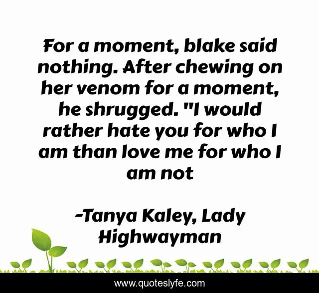This page presents the quote "For a moment, blake said nothing. After chewing on her venom for a moment, he shrugged. "I would rather hate you for who I am than love me for who I am not". Author of this quote is Tanya Kaley, Lady Highwayman. This quote is about love, romance, unrequited-love, tragedy, affection, bitter-sweet,.
