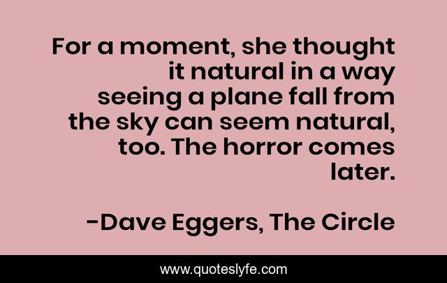 This page presents the quote "For a moment, she thought it natural in a way seeing a plane fall from the sky can seem natural, too. The horror comes later.". Author of this quote is Dave Eggers, The Circle. This quote is about natural, horror, plane, sky,.