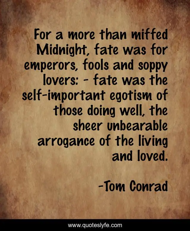 This page presents the quote "For a more than miffed Midnight, fate was for emperors, fools and soppy lovers: - fate was the self-important egotism of those doing well, the sheer unbearable arrogance of the living and loved.". Author of this quote is Tom Conrad. This quote is about love, destiny, fate, rich-pickings-for-ravens, afterlife, tom-conrad, arrogance, chance, fools,.