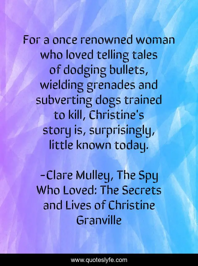 This page presents the quote "For a once renowned woman who loved telling tales of dodging bullets, wielding grenades and subverting dogs trained to kill, Christine's story is, surprisingly, little known today.". Author of this quote is Clare Mulley, The Spy Who Loved: The Secrets and Lives of Christine Granville. This quote is about second-world-war, krystyna-skarbek, christine-granville, secret-agents, spies, wwii, biography,.