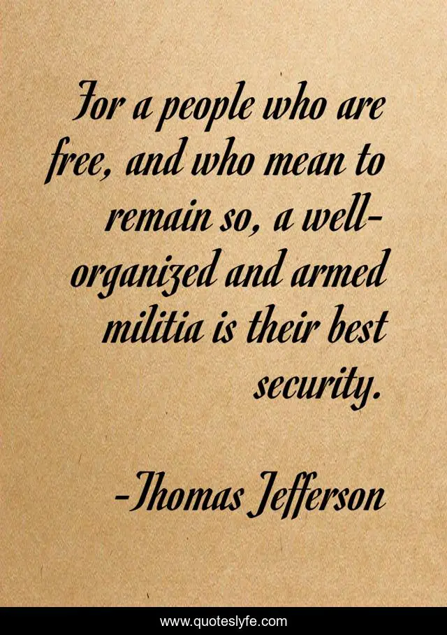 This page presents the quote "For a people who are free, and who mean to remain so, a well-organized and armed militia is their best security.". Author of this quote is Thomas Jefferson. This quote is about security, free, people,.