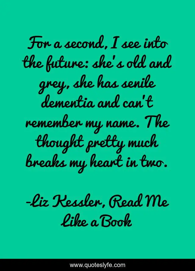 This page presents the quote "For a second, I see into the future: she's old and grey, she has senile dementia and can't remember my name. The thought pretty much breaks my heart in two.". Author of this quote is Liz Kessler, Read Me Like a Book. .