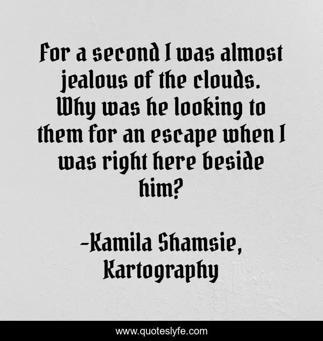 This page presents the quote "For a second I was almost jealous of the clouds. Why was he looking to them for an escape when I was right here beside him?". Author of this quote is Kamila Shamsie, Kartography. This quote is about clouds, jealousy, escape,.