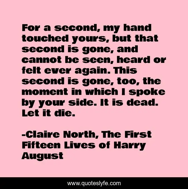 This page presents the quote "For a second, my hand touched yours, but that second is gone, and cannot be seen, heard or felt ever again. This second is gone, too, the moment in which I spoke by your side. It is dead. Let it die.". Author of this quote is Claire North, The First Fifteen Lives of Harry August. This quote is about connection, life,.