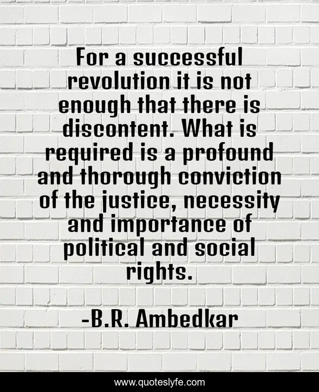 This page presents the quote "For a successful revolution it is not enough that there is discontent. What is required is a profound and thorough conviction of the justice, necessity and importance of political and social rights.". Author of this quote is B.R. Ambedkar. This quote is about justice, activism, revolution, sociology,.
