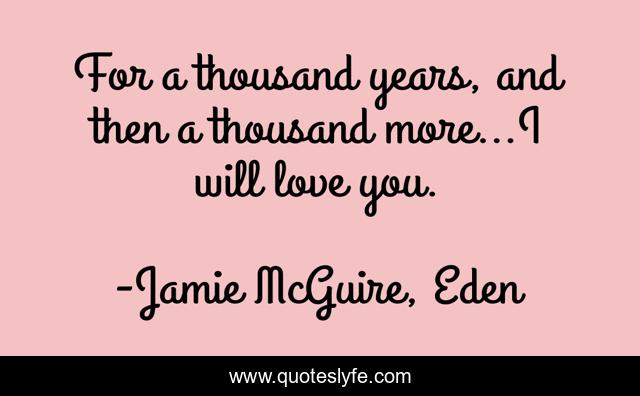 This page presents the quote "For a thousand years, and then a thousand more…I will love you.". Author of this quote is Jamie McGuire, Eden. This quote is about providence, forever, love, eden, affection,.