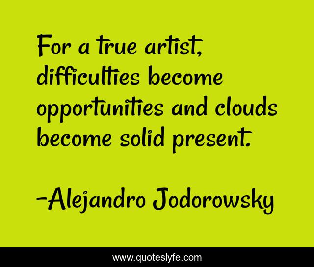 This page presents the quote "For a true artist, difficulties become opportunities and clouds become solid present.". Author of this quote is Alejandro Jodorowsky. This quote is about art, inspiration,.