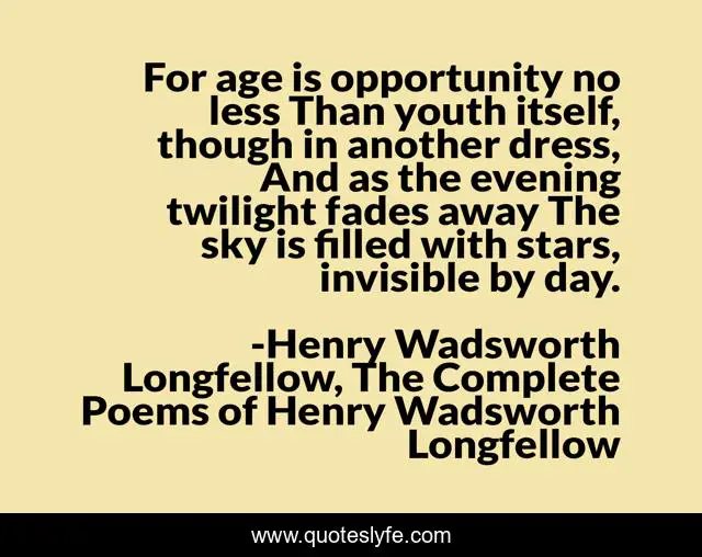 This page presents the quote "For age is opportunity no less Than youth itself, though in another dress, And as the evening twilight fades away The sky is filled with stars, invisible by day.". Author of this quote is Henry Wadsworth Longfellow, The Complete Poems of Henry Wadsworth Longfellow. This quote is about old-age, opportunity, age, youth, stars, twilight,.