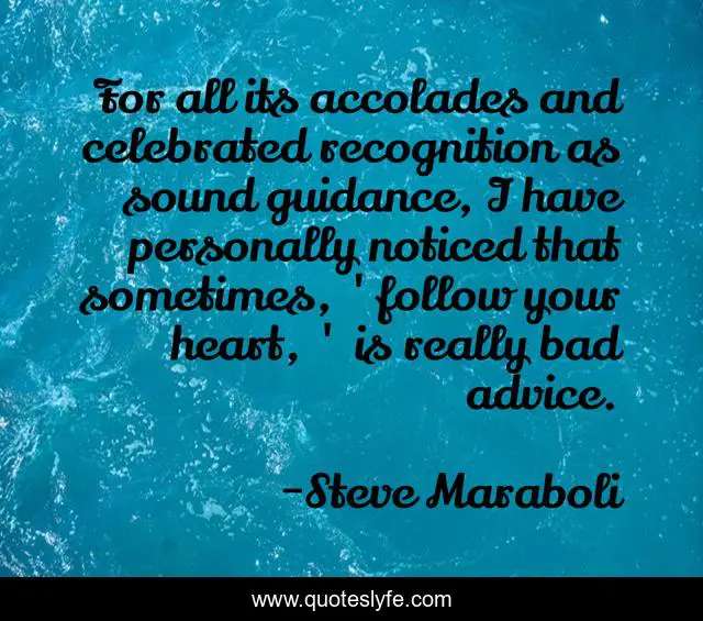 This page presents the quote "For all its accolades and celebrated recognition as sound guidance, I have personally noticed that sometimes, 'follow your heart, ' is really bad advice.". Author of this quote is Steve Maraboli. This quote is about heart, follow-your-heart, love, advice, inspirational, enthusiasm, affection,.
