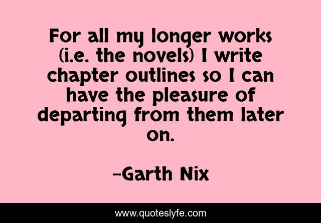 This page presents the quote "For all my longer works (i.e. the novels) I write chapter outlines so I can have the pleasure of departing from them later on.". Author of this quote is Garth Nix. This quote is about enthusiasm, outlines, inspirational, writing,.