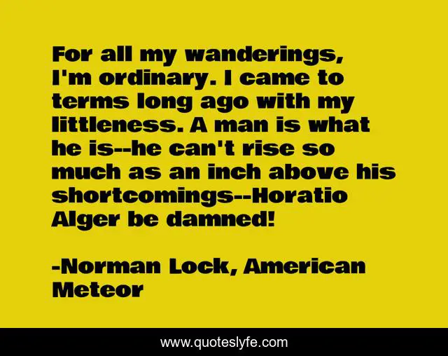 This page presents the quote "For all my wanderings, I'm ordinary. I came to terms long ago with my littleness. A man is what he is--he can't rise so much as an inch above his shortcomings--Horatio Alger be damned!". Author of this quote is Norman Lock, American Meteor. This quote is about average-joe, self-image, self-knowledge,.