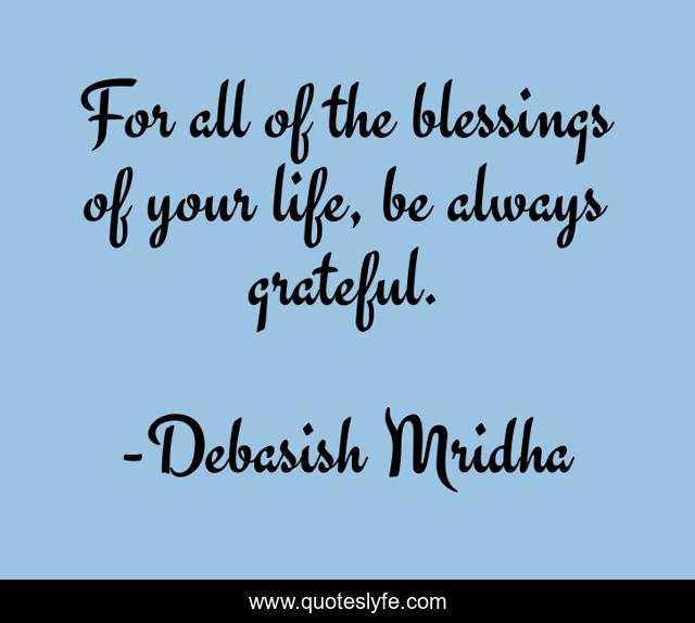 This page presents the quote "For all of the blessings of your life, be always grateful.". Author of this quote is Debasish Mridha. This quote is about always-be-grateful, philosophy, debasish-mridha, quotes, inspirational, be-grateful, enthusiasm, blessings-of-life, debasish-mridha-m-d,.