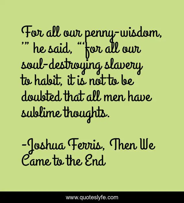 This page presents the quote "For all our penny-wisdom, ’” he said, “‘for all our soul-destroying slavery to habit, it is not to be doubted that all men have sublime thoughts.". Author of this quote is Joshua Ferris, Then We Came to the End. .