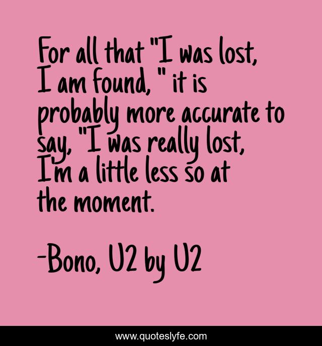 This page presents the quote "For all that "I was lost, I am found, " it is probably more accurate to say, "I was really lost, I'm a little less so at the moment.". Author of this quote is Bono, U2 by U2. .