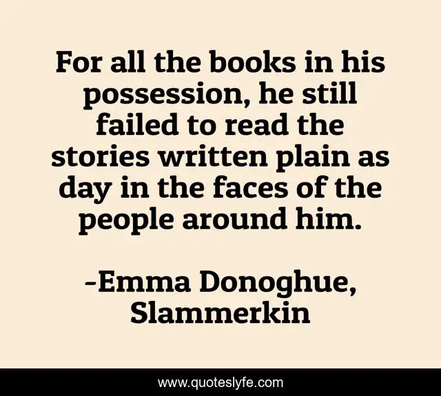 This page presents the quote "For all the books in his possession, he still failed to read the stories written plain as day in the faces of the people around him.". Author of this quote is Emma Donoghue, Slammerkin. This quote is about human-nature, books, stories,.