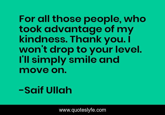 This page presents the quote "For all those people, who took advantage of my kindness. Thank you. I won't drop to your level. I'll simply smile and move on.". Author of this quote is Saif Ullah. This quote is about enthusiasm, kindness, karma, inspirational,.