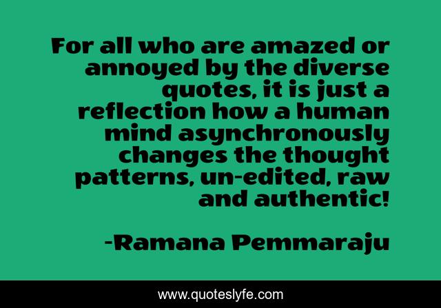 This page presents the quote "For all who are amazed or annoyed by the diverse quotes, it is just a reflection how a human mind asynchronously changes the thought patterns, un-edited, raw and authentic!". Author of this quote is Ramana Pemmaraju. This quote is about intelligence, mind, thoughts,.