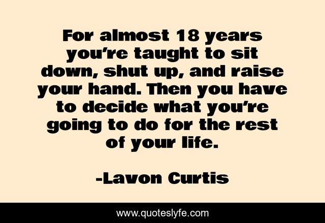 This page presents the quote "For almost 18 years you’re taught to sit down, shut up, and raise your hand. Then you have to decide what you’re going to do for the rest of your life.". Author of this quote is Lavon Curtis. This quote is about life, decisions, school,.