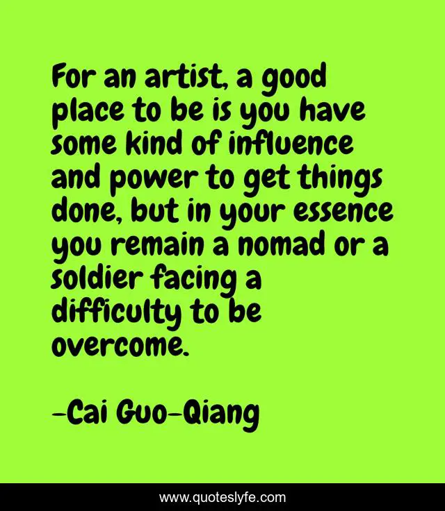 This page presents the quote "For an artist, a good place to be is you have some kind of influence and power to get things done, but in your essence you remain a nomad or a soldier facing a difficulty to be overcome.". Author of this quote is Cai Guo-Qiang. This quote is about good, influence, artist,.