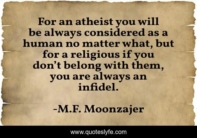 This page presents the quote "For an atheist you will be always considered as a human no matter what, but for a religious if you don’t belong with them, you are always an infidel.". Author of this quote is M.F. Moonzajer. This quote is about religious, infedel,.