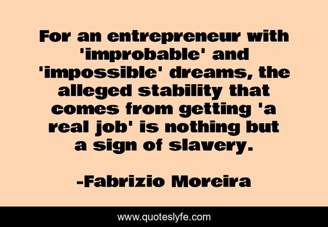 This page presents the quote "For an entrepreneur with 'improbable' and 'impossible' dreams, the alleged stability that comes from getting 'a real job' is nothing but a sign of slavery.". Author of this quote is Fabrizio Moreira. This quote is about impossible, job, slavery,.