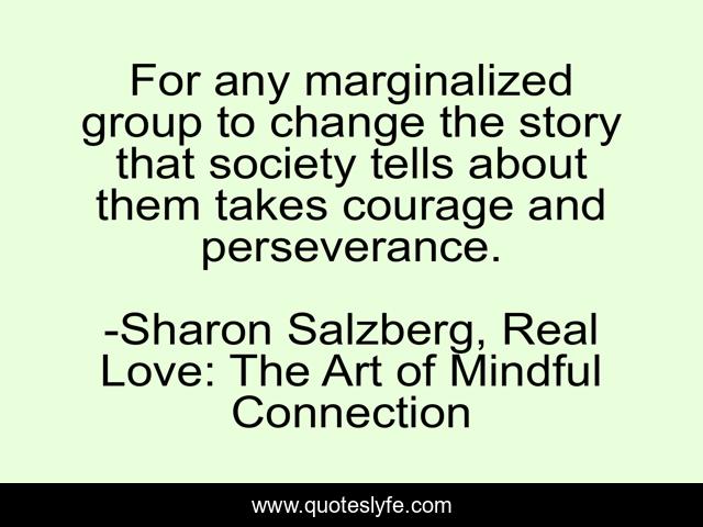 This page presents the quote "For any marginalized group to change the story that society tells about them takes courage and perseverance.". Author of this quote is Sharon Salzberg, Real Love: The Art of Mindful Connection. This quote is about story, social-justice, minority, storytelling, courage, inspirational, enthusiasm,.