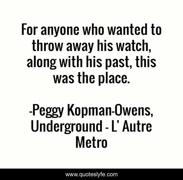 "Peggy Kopman-Owens, Underground - L' Autre Metro Quotes." Quoteslyfe.com, 2025. Mon. 08 Dec. 2025. <https://www.quoteslyfe.com/quote/For-anyone-who-wanted-to-throw-away-137603>.