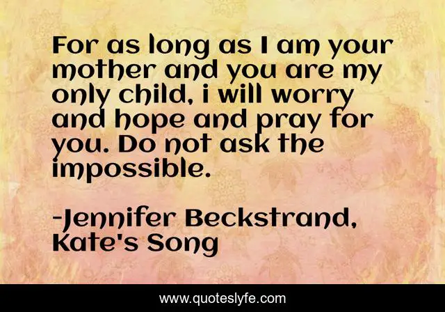This page presents the quote "For as long as I am your mother and you are my only child, i will worry and hope and pray for you. Do not ask the impossible.". Author of this quote is Jennifer Beckstrand, Kate's Song. .