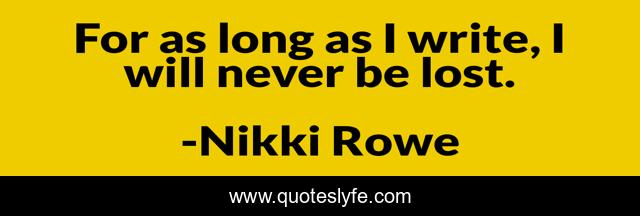 This page presents the quote "For as long as I write, I will never be lost.". Author of this quote is Nikki Rowe. This quote is about writerslife, writer, dream, writers, author,.