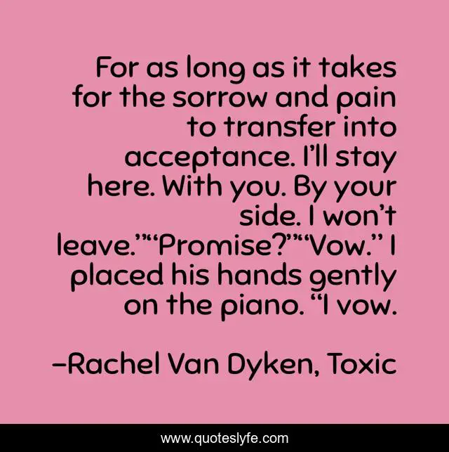 This page presents the quote "For as long as it takes for the sorrow and pain to transfer into acceptance. I’ll stay here. With you. By your side. I won’t leave.”“Promise?”“Vow.” I placed his hands gently on the piano. “I vow.". Author of this quote is Rachel Van Dyken, Toxic. This quote is about forever, hug, love, acceptance, life, together, stay, grief, vow,.
