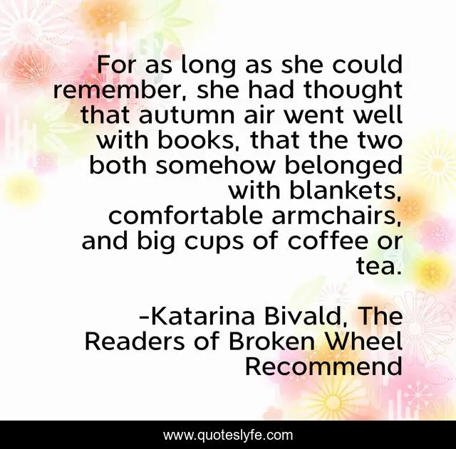 This page presents the quote "For as long as she could remember, she had thought that autumn air went well with books, that the two both somehow belonged with blankets, comfortable armchairs, and big cups of coffee or tea.". Author of this quote is Katarina Bivald, The Readers of Broken Wheel Recommend. This quote is about autumn, books, reading,.