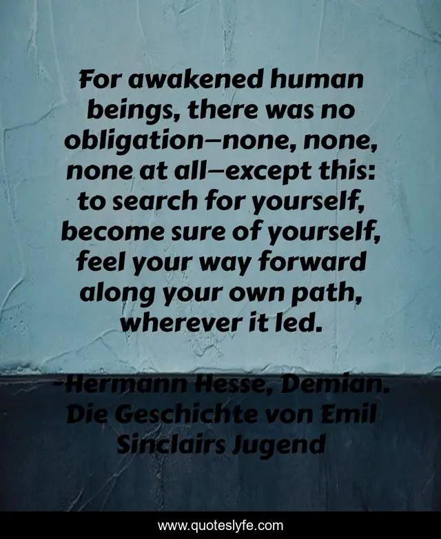 This page presents the quote "For awakened human beings, there was no obligation—none, none, none at all—except this: to search for yourself, become sure of yourself, feel your way forward along your own path, wherever it led.". Author of this quote is Hermann Hesse, Demian. Die Geschichte von Emil Sinclairs Jugend. This quote is about self-discovery, self-awareness,.