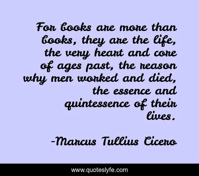 This page presents the quote "For books are more than books, they are the life, the very heart and core of ages past, the reason why men worked and died, the essence and quintessence of their lives.". Author of this quote is Marcus Tullius Cicero. .