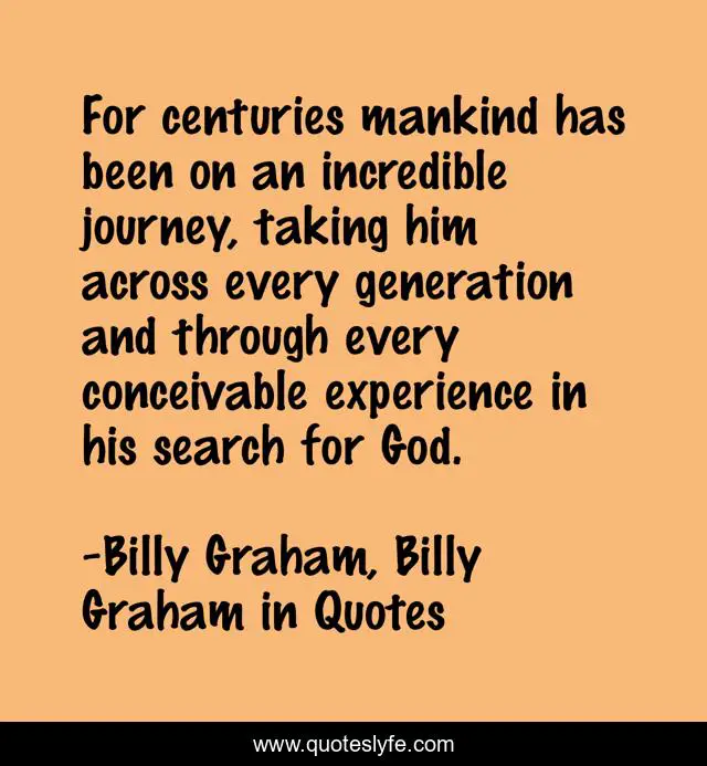 This page presents the quote "For centuries mankind has been on an incredible journey, taking him across every generation and through every conceivable experience in his search for God.". Author of this quote is Billy Graham, Billy Graham in Quotes. This quote is about god, billy-graham,.