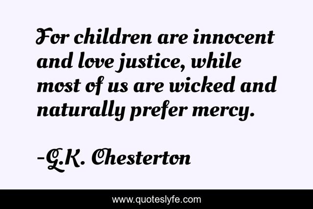This page presents the quote "For children are innocent and love justice, while most of us are wicked and naturally prefer mercy.". Author of this quote is G.K. Chesterton. This quote is about justice, mercy, wickedness, innocence,.