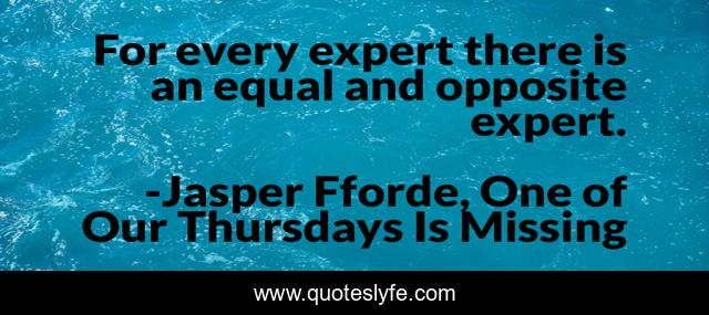 This page presents the quote "For every expert there is an equal and opposite expert.". Author of this quote is Jasper Fforde, One of Our Thursdays Is Missing. .