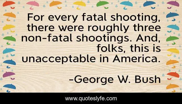 This page presents the quote "For every fatal shooting, there were roughly three non-fatal shootings. And, folks, this is unacceptable in America.". Author of this quote is George W. Bush. This quote is about politics, stupid, violence,.