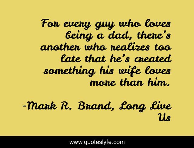 This page presents the quote "For every guy who loves being a dad, there’s another who realizes too late that he’s created something his wife loves more than him.". Author of this quote is Mark R. Brand, Long Live Us. This quote is about funny, fatherhood, dark, parenting, unspoken, marriage, truth, hidden, comedy,.