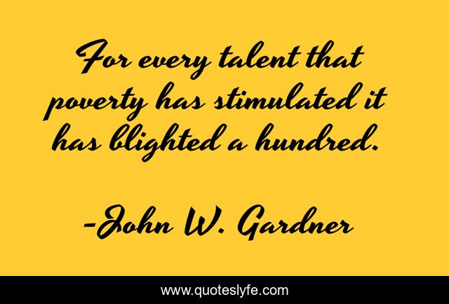 This page presents the quote "For every talent that poverty has stimulated it has blighted a hundred.". Author of this quote is John W. Gardner. This quote is about poverty, talent,.