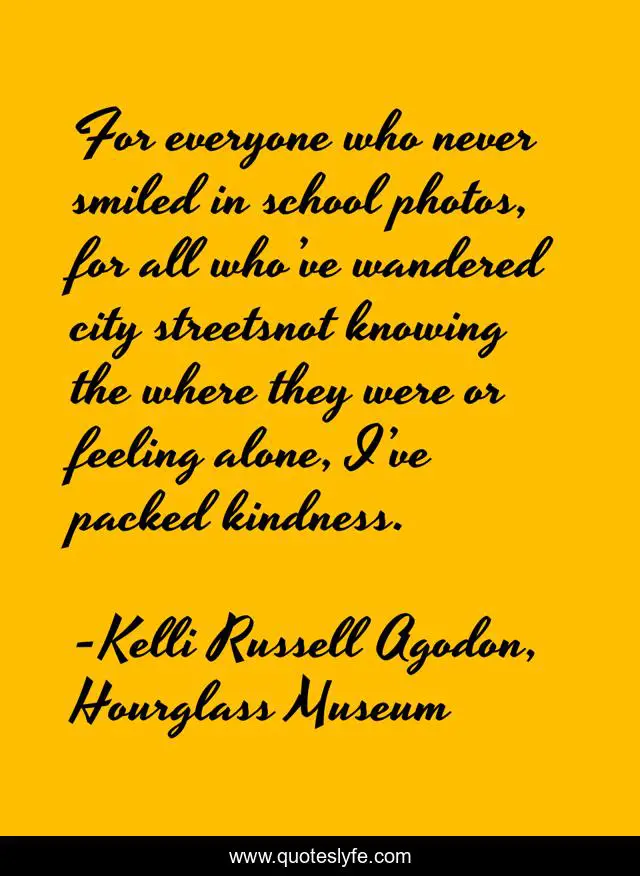 "Kelli Russell Agodon, Hourglass Museum Quotes." Quoteslyfe.com, 2025. Mon. 08 Dec. 2025. <https://www.quoteslyfe.com/quote/For-everyone-who-never-smiled-in-school-124637>.