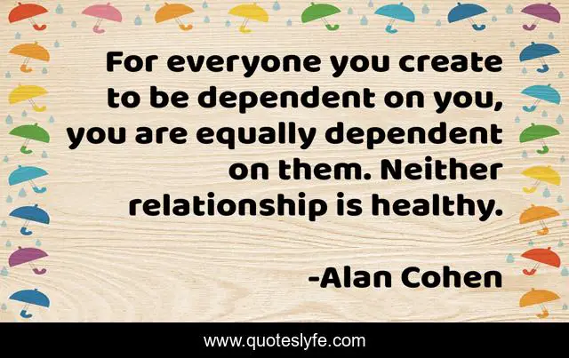 This page presents the quote "For everyone you create to be dependent on you, you are equally dependent on them. Neither relationship is healthy.". Author of this quote is Alan Cohen. This quote is about dependency, healthy-living,.