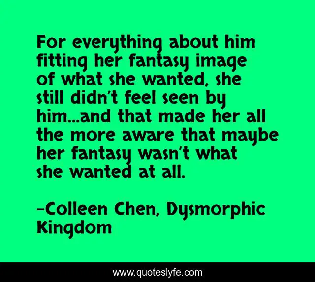 This page presents the quote "For everything about him fitting her fantasy image of what she wanted, she still didn’t feel seen by him…and that made her all the more aware that maybe her fantasy wasn’t what she wanted at all.". Author of this quote is Colleen Chen, Dysmorphic Kingdom. This quote is about fantasy, love, infatuation, affection, reality,.