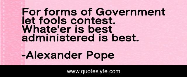 This page presents the quote "For forms of Government let fools contest. Whate'er is best administered is best.". Author of this quote is Alexander Pope. This quote is about politics, alexander, political, pope, government,.