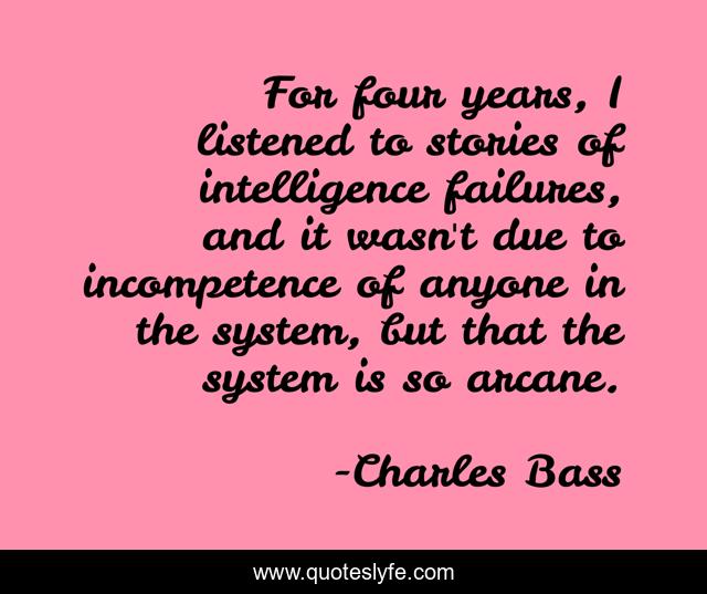 This page presents the quote "For four years, I listened to stories of intelligence failures, and it wasn't due to incompetence of anyone in the system, but that the system is so arcane.". Author of this quote is Charles Bass. This quote is about incompetence, system, years,.