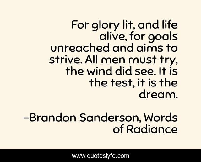 This page presents the quote "For glory lit, and life alive, for goals unreached and aims to strive. All men must try, the wind did see. It is the test, it is the dream.". Author of this quote is Brandon Sanderson, Words of Radiance. This quote is about wit, hoid, dreams, glory,.