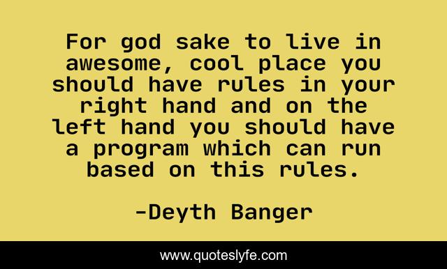 This page presents the quote "For god sake to live in awesome, cool place you should have rules in your right hand and on the left hand you should have a program which can run based on this rules.". Author of this quote is Deyth Banger. This quote is about god, live, for,.