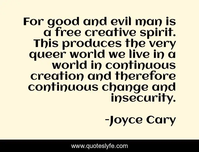 This page presents the quote "For good and evil man is a free creative spirit. This produces the very queer world we live in a world in continuous creation and therefore continuous change and insecurity.". Author of this quote is Joyce Cary. .