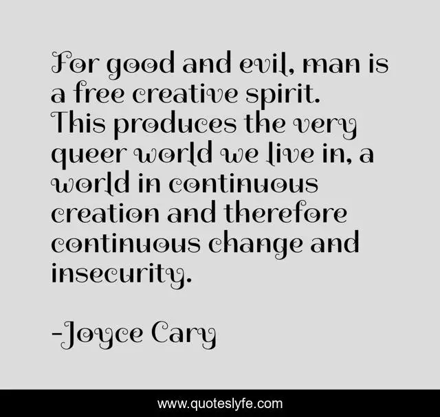 This page presents the quote "For good and evil, man is a free creative spirit. This produces the very queer world we live in, a world in continuous creation and therefore continuous change and insecurity.". Author of this quote is Joyce Cary. This quote is about good, evil, good and evil,.