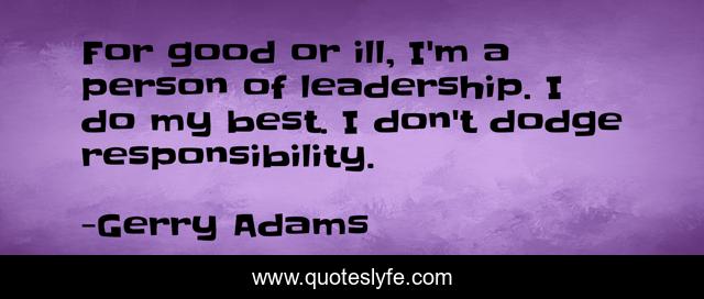 This page presents the quote "For good or ill, I'm a person of leadership. I do my best. I don't dodge responsibility.". Author of this quote is Gerry Adams. This quote is about good, responsibility, best,.